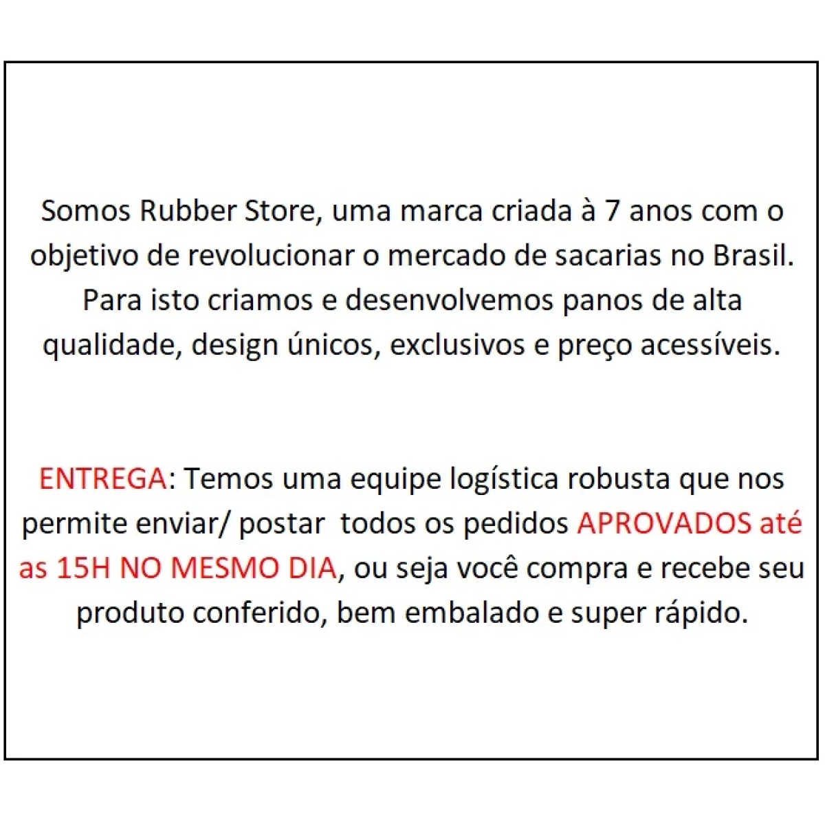 Somos Rubber Store, uma marca criada à 7 anos com o objetivo de revolucionar o mercado de sacarias no Brasil. Para isto criamos e desenvolvemos panos de alta qualidade, design únicos, exclusivos e preço acessíveis.