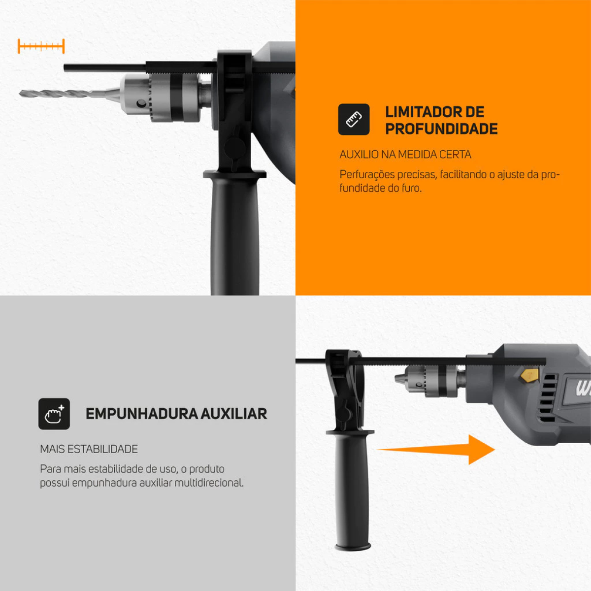 - O limitador de profundidade da Parafusadeira e Furadeira de Impacto WF 700K10 opera de forma precisa durante todo o trabalho.