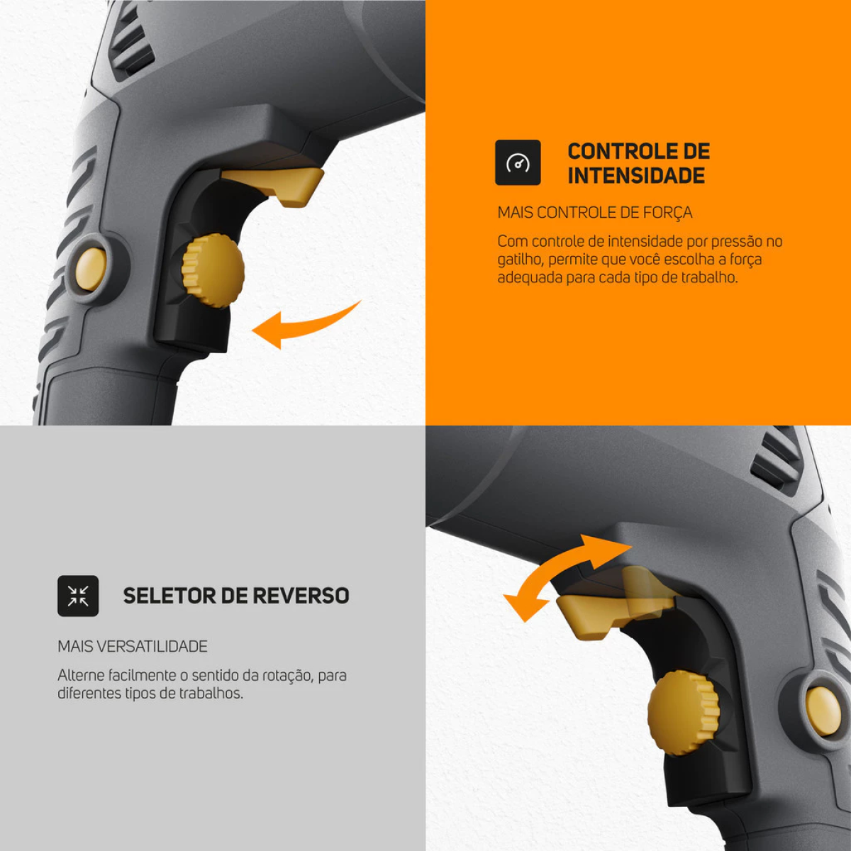 Seu botão comutador permite executar diferentes tipos de perfurações, independente da tarefa. A versatilidade do equipamento permite que você possa utilizá-lo para perfurações sem impacto em objetos de madeira e aço, assim como perfurações com impacto em peças de concreto e alvenaria, com excelência.