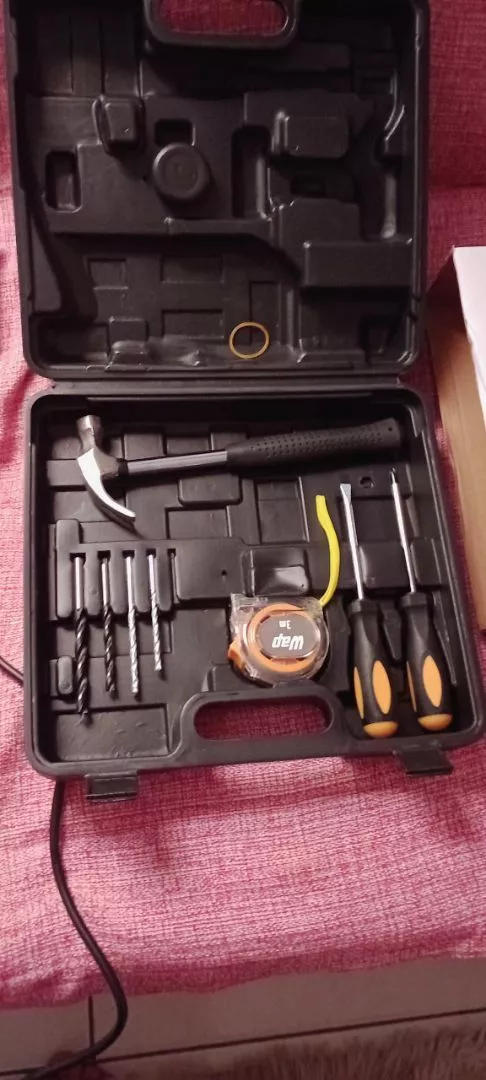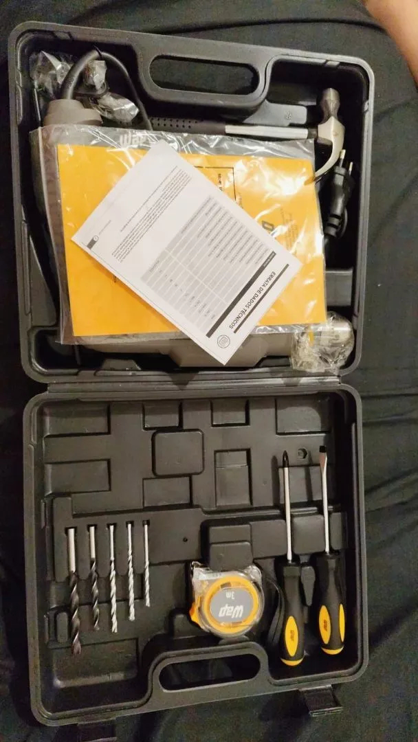 Tenha uma solução completa para dar start no seu projeto! Em uma maleta compacta, a ferramenta vem com 11 acessórios, entre eles: punho auxiliar multidirecional, limitador de profundidade, trena de 3 metros, chave philips, chave de fenda, brocas para madeira (6 e 8 mm), brocas para alvenaria (5, 6 e 8 mm) e martelo.